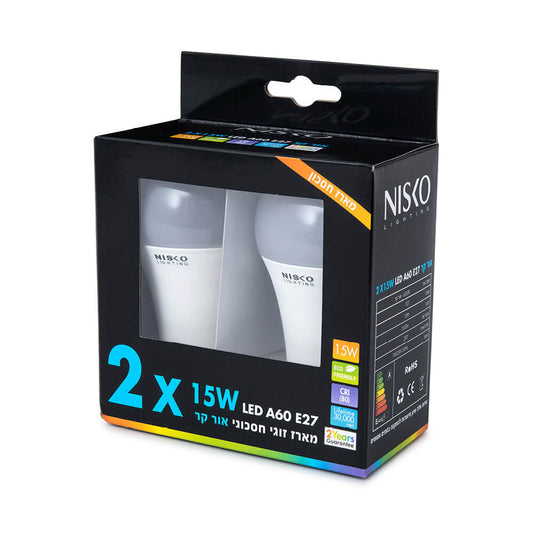 זוג נורות ליבון לד לבן E27 15W אור קר