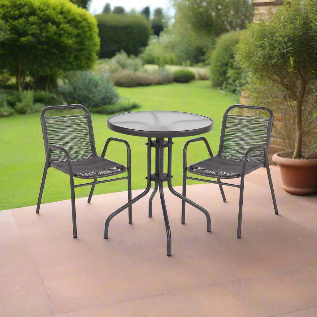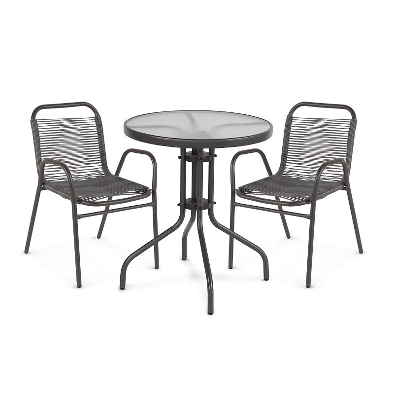 כסאות לגינה ולמרפסת עשויים מתכת איכותית, בעיצוב מודרני. שלדת הכסאות בצבע אפור כהה עם מושב ומשענת עשויים חוטי פלסטיק דמוי ראטן בצבע אפור