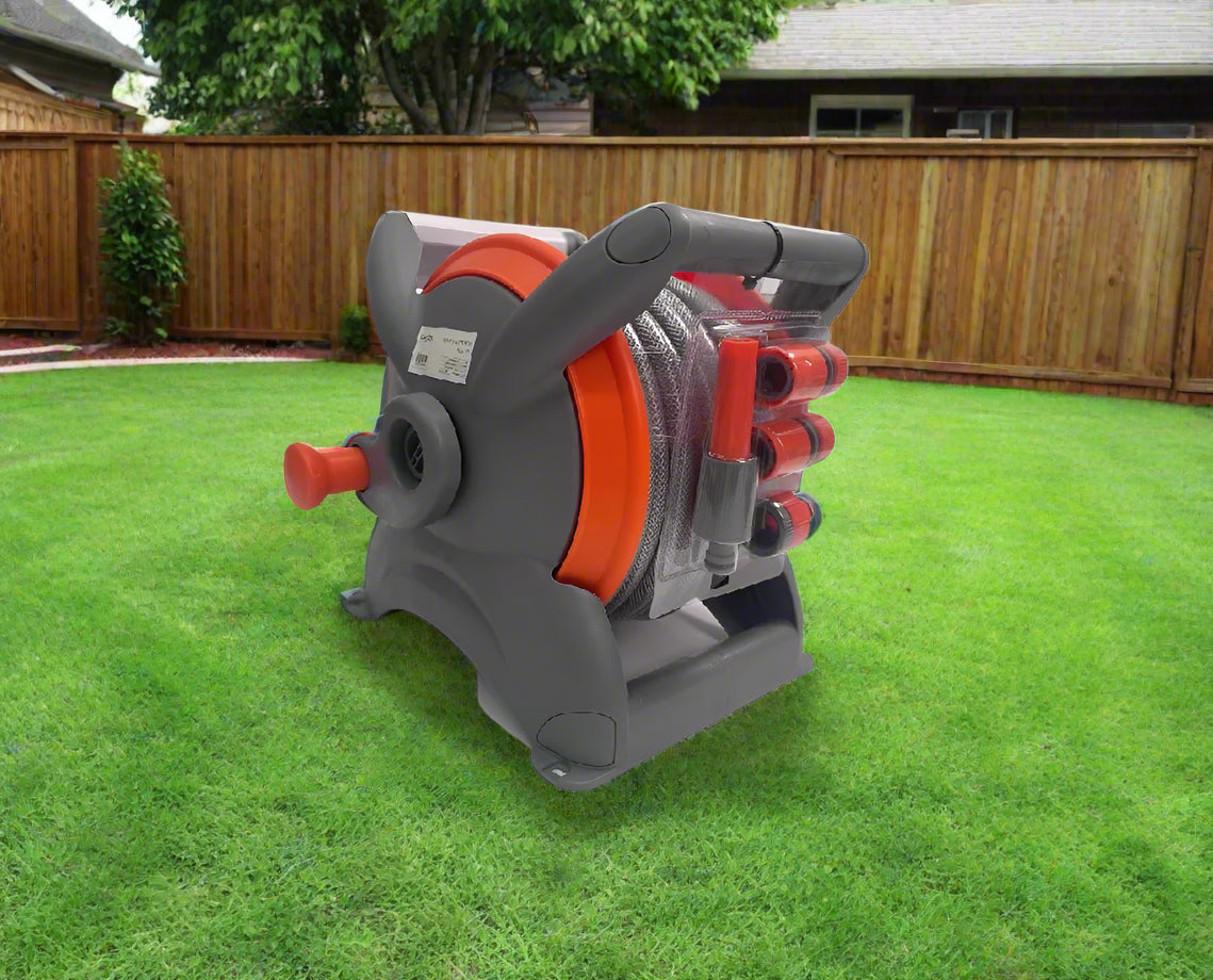 גלגלת השקיה איכותית, קומפקטית ונוחה לאחסון, המגיעה עם צינור, מחברים וזרנוק מים.