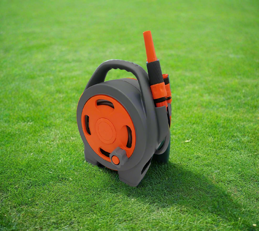 גלגלת השקייה איכותית הכוללת אקדח השקיה, מחברים, צינור חיבור לברז באורך של 1.5 מטר וצינור ההשקיה.