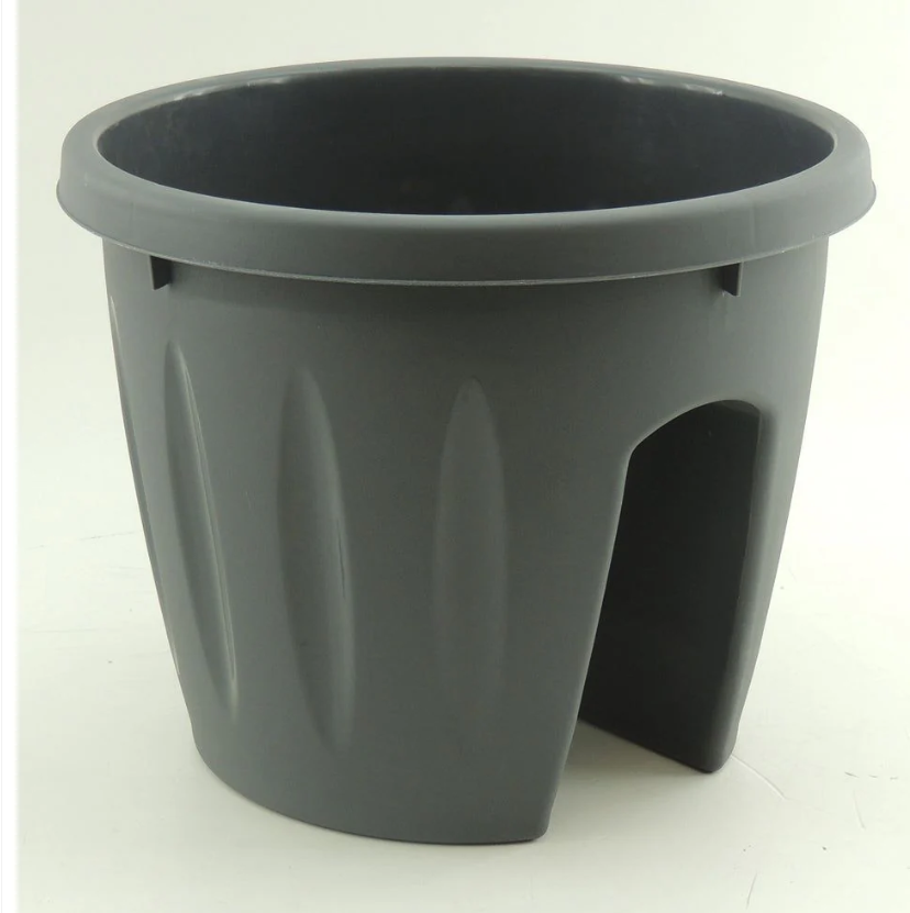 אדנית עגולה בצבע אפור המתאימה למעקה המרפסת.