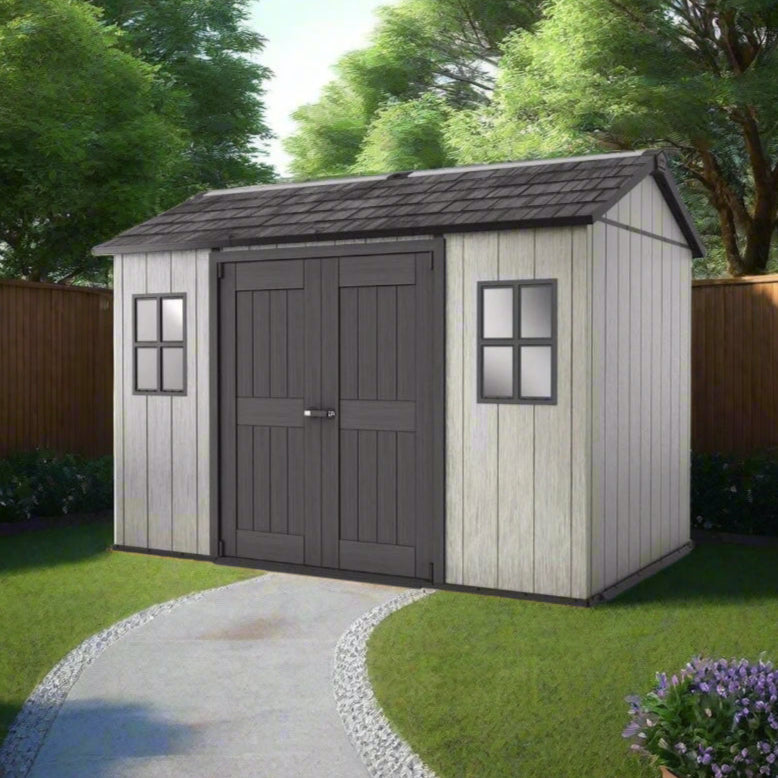 למחסן עיצוב טבעי המשתלב באופן טבעי בכל גינה, וחלונות בעיצוב רומנטי המאפשרים אוורור והכנסת אור. ויקרות המבנה ניתנים לצביעה.