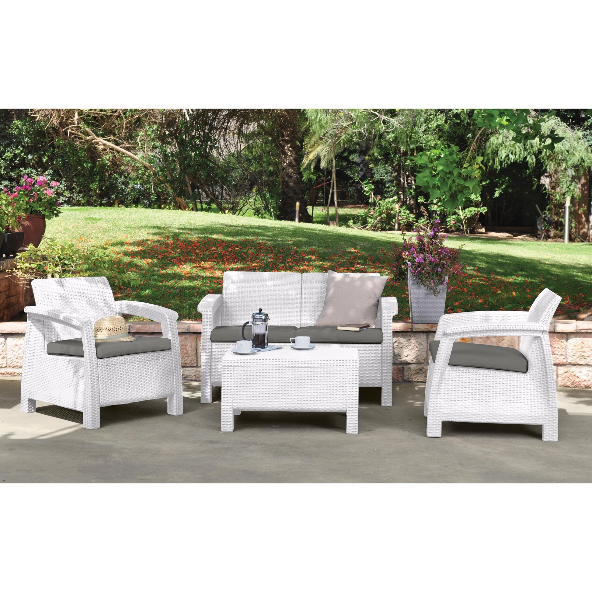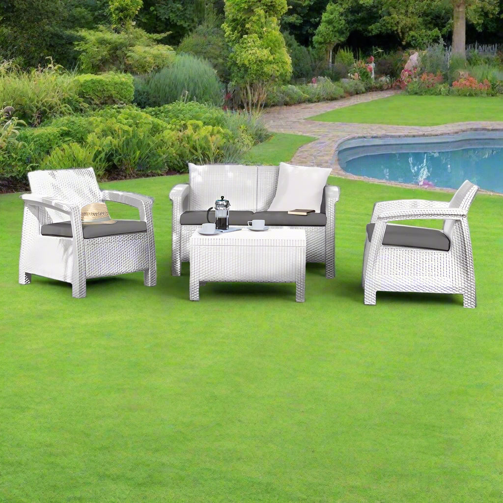 פינת ישיבה למרפסת ולגינה, 4 חלקים, בעיצוב נקי בסגנון ראטן בצבע לבן. הסט עשוי פלסטיק חזק, עמיד בתנאי חוץ.