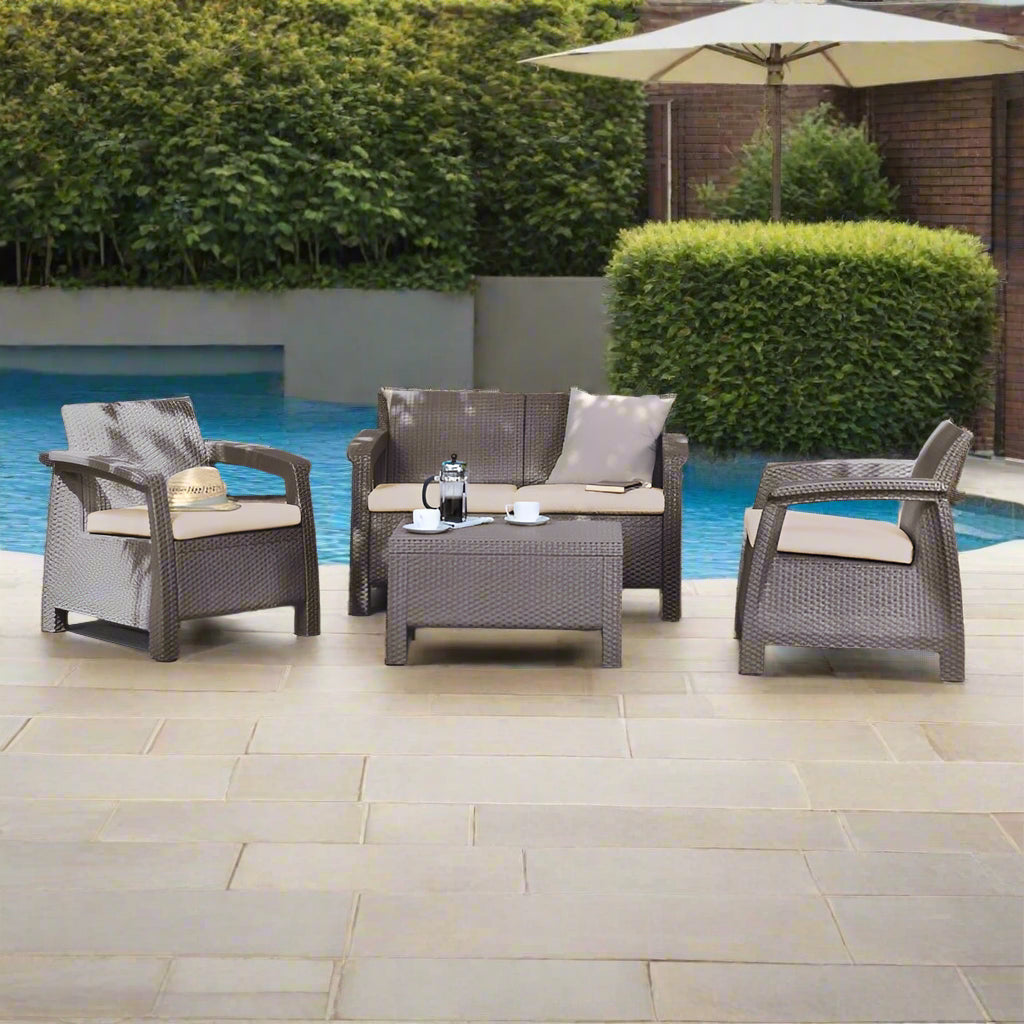 המערכת כוללת 2 כורסאות יחיד, כורסה זוגית ושולחן אירוח. עשוי פלסטיק חזק בעיצוב ראטן. עמידות בפני פגעי מזג האוויר, בעל מבנה יציב וקל משקל המאפשר ניוד קל. כריות מושב נוחות.