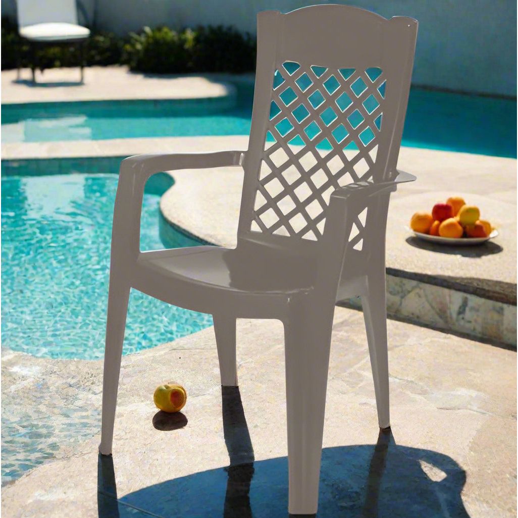 כיסא לירון מפואר, מעוצב ונוח במיוחד, הכולל מושב רחב ועמוק, גב גבוה בעיצוב רשת ומשענות לידיים. חזק ואיכותי, העמיד בפני פגעי מזג האוויר, ולכן מתאים במיוחד לשימוש במרפסת, בחצר וליד הבריכה. ניתן לערום בקלות כיסא על גבי כיסא לחסכון במקום אחסון.
