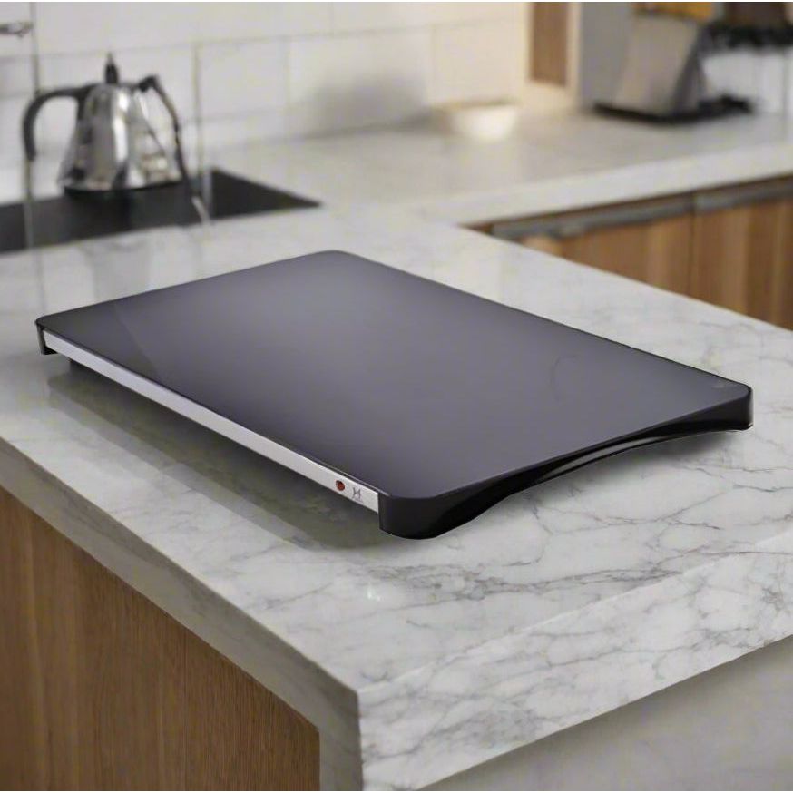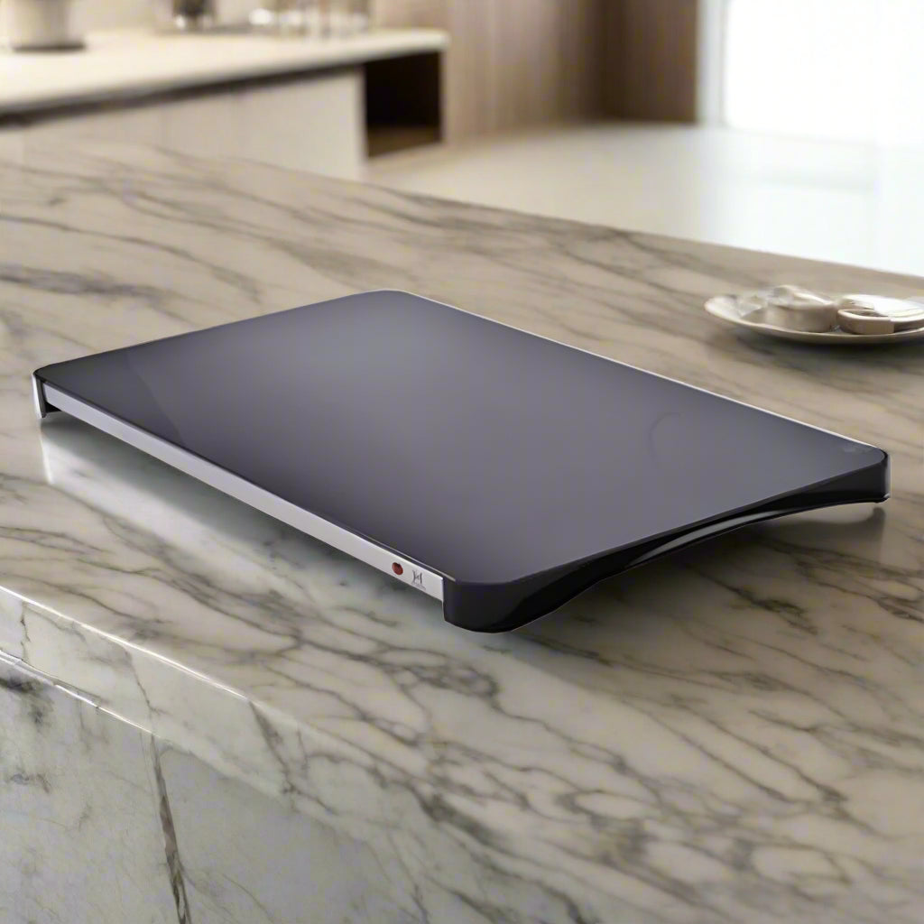 פלטה קרמית מעוצבת לשבת, בעלת משטח זכוכית שחורה מחוסמת בעיצוב חדשני עם תאורת לד בחזית.