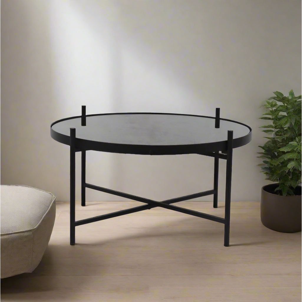 שולחן בעל מראה מודרני ואלגנטי, עם רגליים ומסגרת ממתכת בגוון שחור, ועליונה מזכוכית מושחרת שמשלימה את המראה היוקרתי.