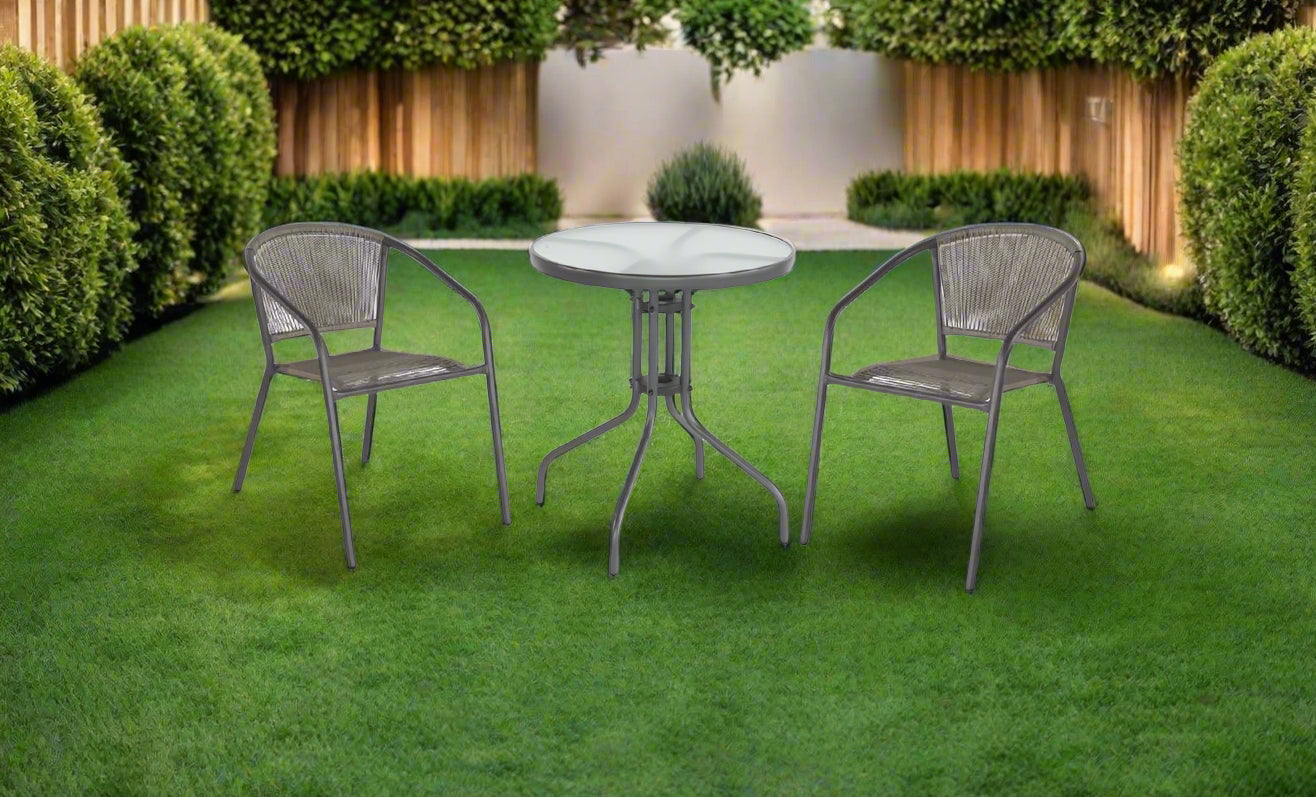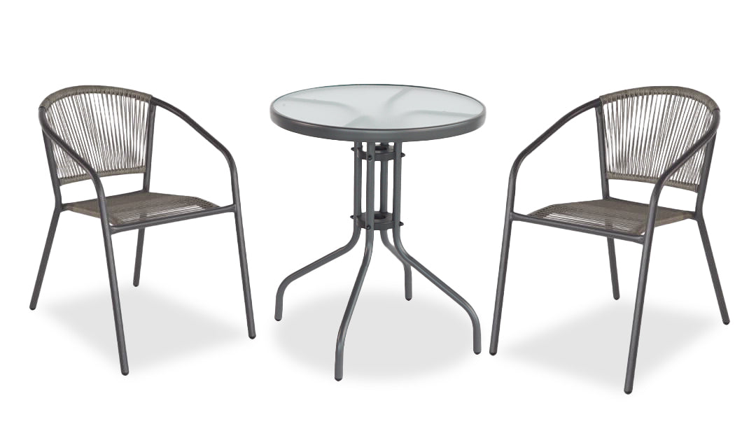 שולחן עגול עשוי מתכת בצבע אפור כהה, בשילוב פלטת זכוכית. אידיאלי לשימוש במרפסת, בגינה, בבתי קפה ועוד. מתאים ל-2 כסאות.