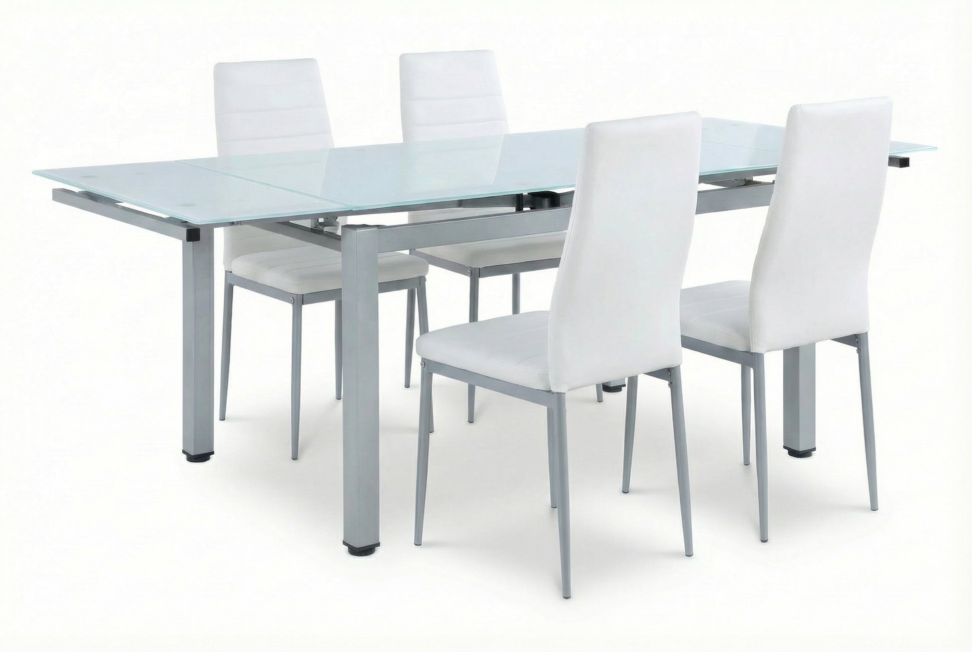 שולחן אוכל נפתח בעיצוב מודרני בצבע לבן, עשוי ממתכת חזקה וזכוכית מחוסמת בעובי 8 מ"מ.