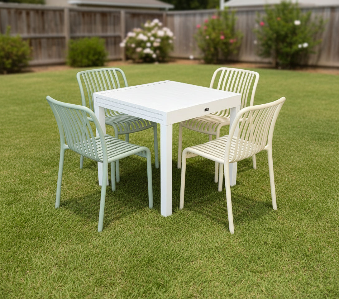 שולחן אלומיניום איכותי בצבע לבן, בעיצוב מודרני עם פלטת שולחן אלומיניום. גודל השולחן 90*90 ס"מ במצב סגור הנפתח ל 180 ס"מ. מנגנון פתיחה וסגירה נוח.