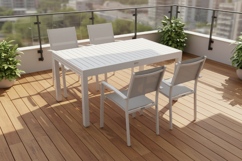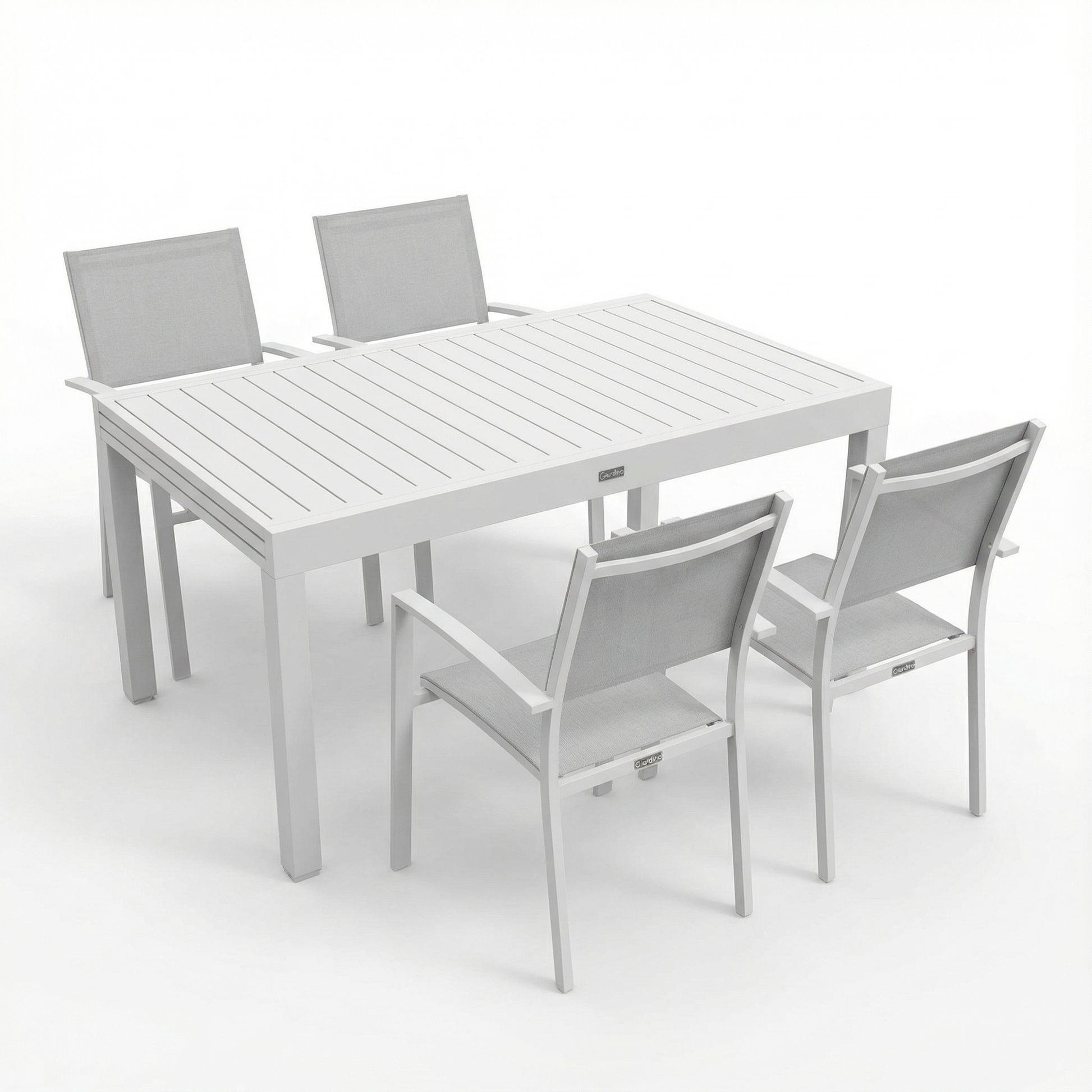 שולחן אלומיניום איכותי בצבע לבן, בעיצוב מודרני עם פלטת שולחן אלומיניום. גודל השולחן 90*135 ס"מ במצב סגור הנפתח ל 270 ס"מ. מנגנון פתיחה וסגירה נוח.