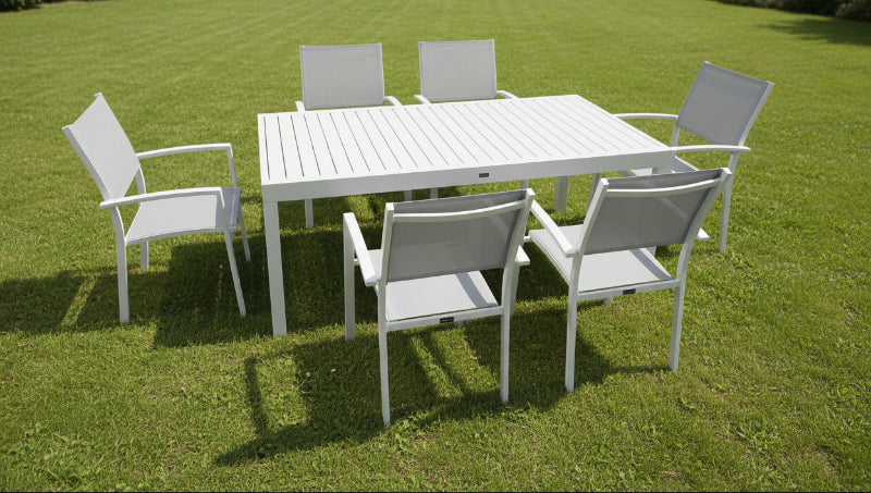 שולחן אלומיניום איכותי בצבע לבן, בעיצוב מודרני עם פלטת שולחן אלומיניום. גודל השולחן 100*200 ס"מ במצב סגור הנפתח ל 320 ס"מ. מנגנון פתיחה וסגירה נוח.