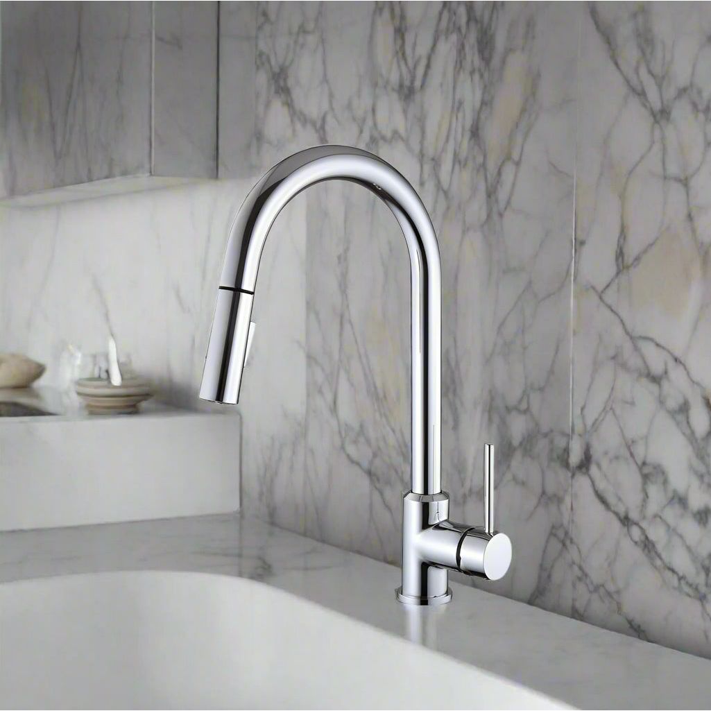 ברז מטבח גבוה נשלף עשוי BRASS, בעיצוב איטלקי. בעל מראה אלגנטי ופייה מסתובבת.