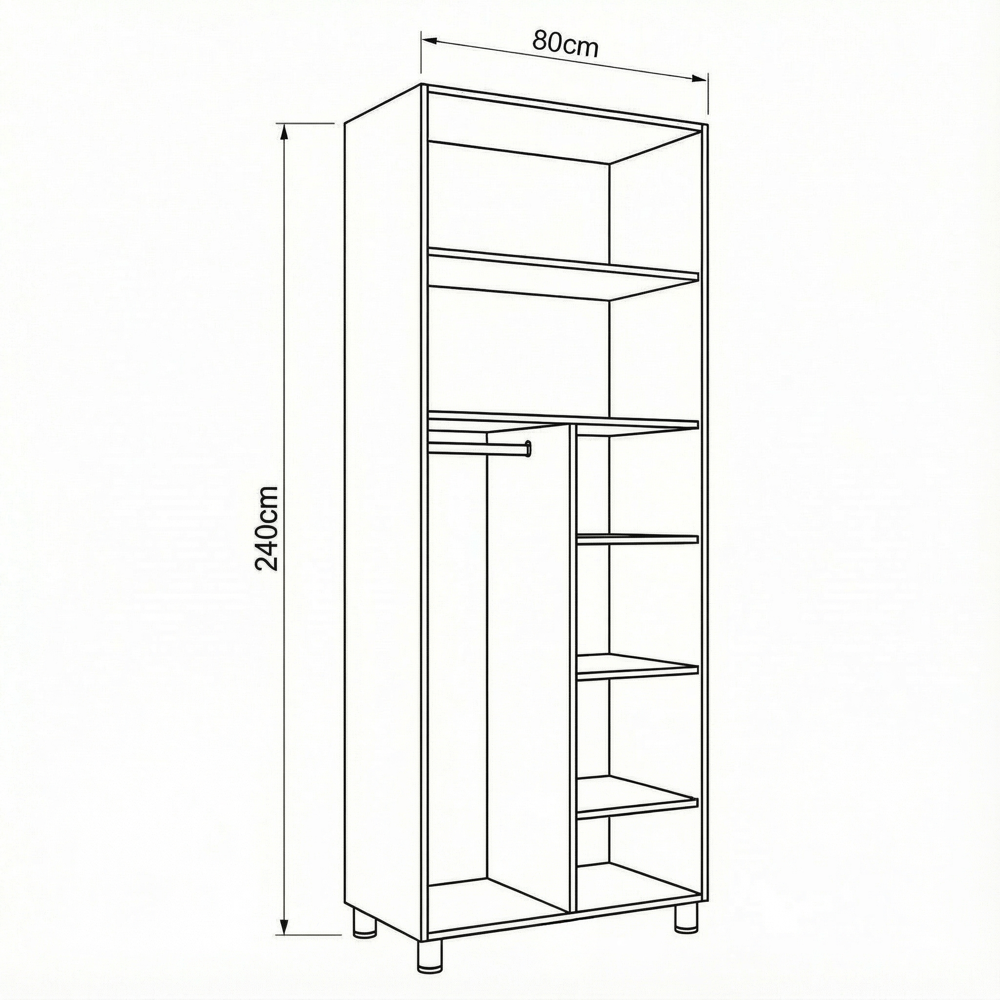 חלוקה של הארון: צד אחד תליה 40 ס"מ וצד שני 3 מדפים 40 ס"מ ומעל 2 מדפים 80 ס"מ.