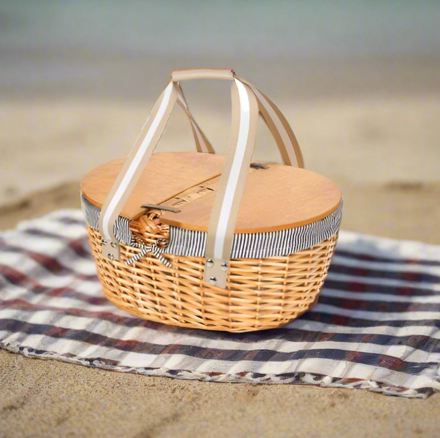 ערכת פיקניק מאובזרת לזוג, סלסלת פיקניק מקש עם מכסה עליון המשמש גם כשולחן. הערכה כוללת: