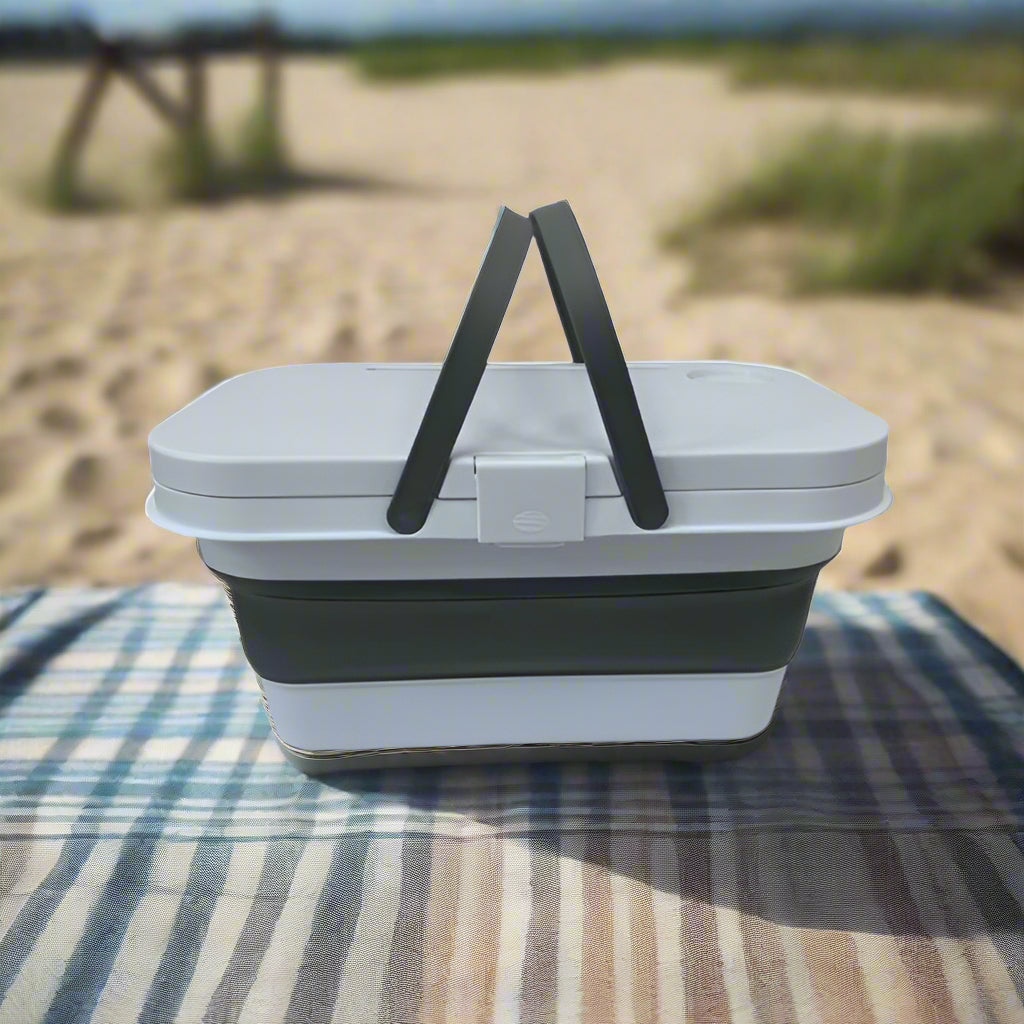 סלסלת פיקניק מתקפלת בנפח של 22 ליטרים, מכסה עליון ההופך לשולחן נשלף, סגירה הרמטית של הכיסוי העליון לשמירה על טריות המזון, יכול לשמש כצידנית (יש להוסיף קרח או קרחום). מידות הסלסלה מקופלת עם המכסה סגור 9*28.5*47.5 ס”מ, מידות, הסלסלה כאשר היא פתוחה עם המכסה