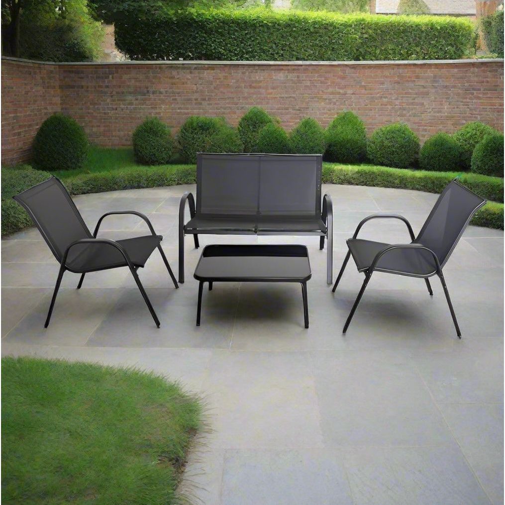 פינת ישיבה למרפסת ולגינה עשויה מתכת איכותית, עם שילוב בד סלינג. הסט בצבע שחור וכולל כורסא דו מושבית, שתי כורסאות יחיד ושולחן זכוכית.