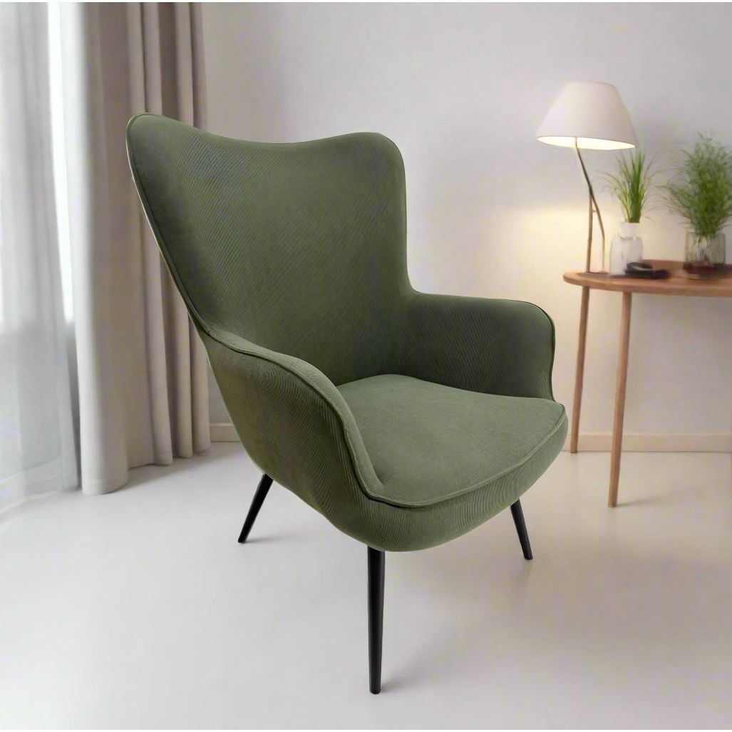 כורסא מעוצבת, מרופדת בבד קורדרוי. רגלי מתכת בצבע שחור.