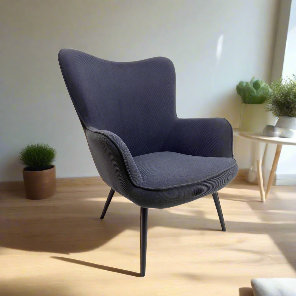 כורסא מעוצבת, מרופדת בבד קורדרוי, רגלי מתכת בצבע שחור.