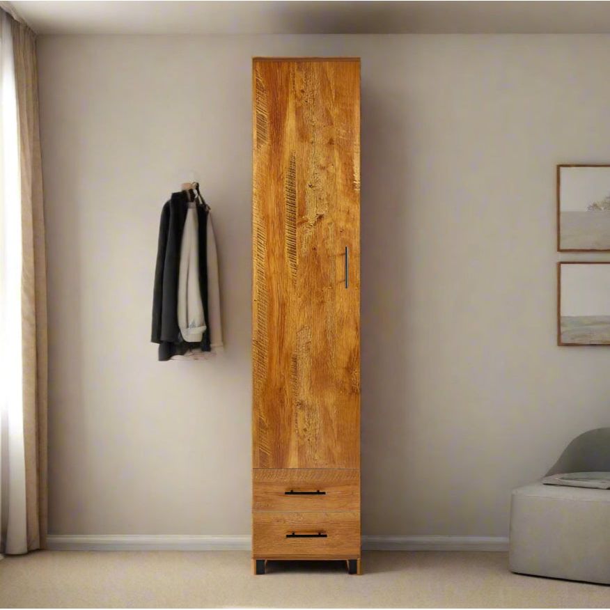 ארון דלת אחת שתי מגירות, צבע עץ אלון. עשוי עץ סיבית בציפוי מלמין. עובי לוחות 16 מ"מ. לוח אחורי 2.7 מ"מ עשויים MDF.