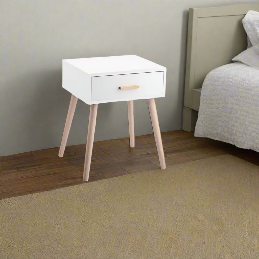שידת לילה כוללת מגירה אחת ועשויה עץ.