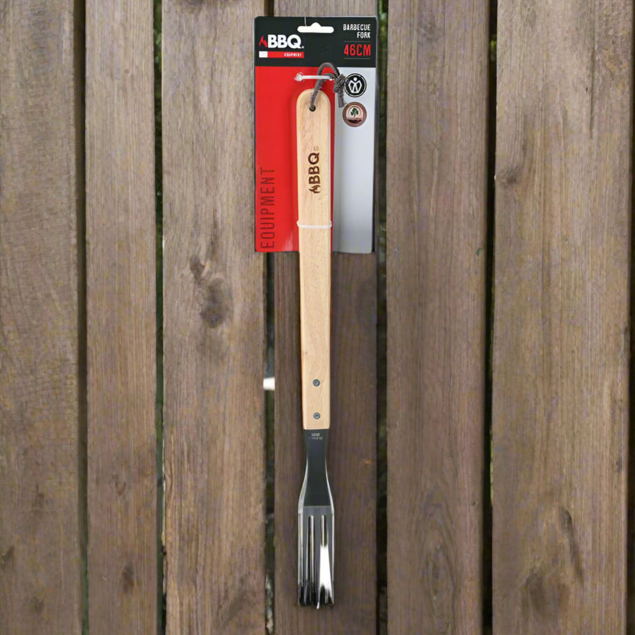 מזלג למנגל עשוי נירוסטה איכותית עם ידית מעץ. באורך כ-46 ס"מ.