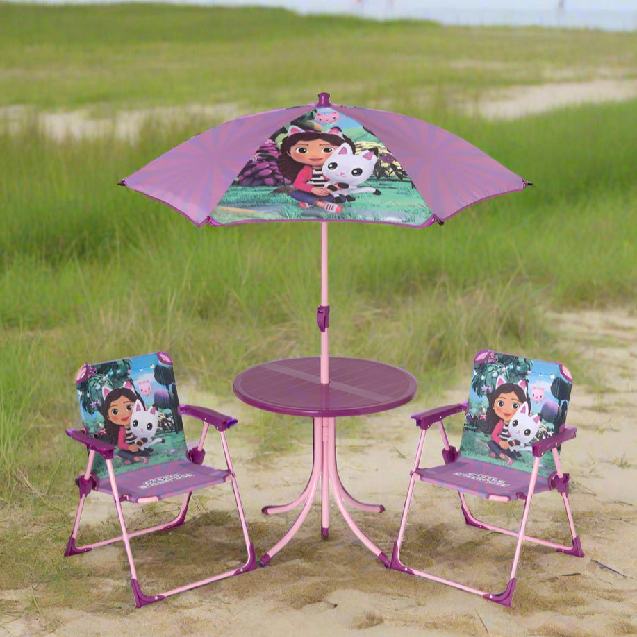 סט שולחן שמשיה ו-2 כיסאות בית הבובות של גבי תוכנן במיוחד כדי שהילדים שלכם ייהנו מחוץ לבית. הסט עשוי ממסגרת מתכת, יציב וחזק.