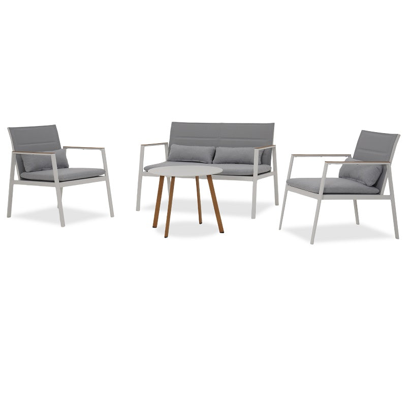 מערכת ישיבה לגינה ולמרפסת עשויה מתכת איכותית בצבע לבן עם ידיות דמוי עץ. בד סלינג מרופד בצבע אפור ושולחן מתכת עגול.