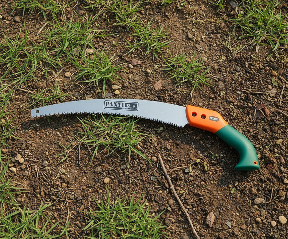 מסור ידני עם להב מעוקל באורך 65 ס"מ, ידית פלסטיק לאחיזה נוחה.