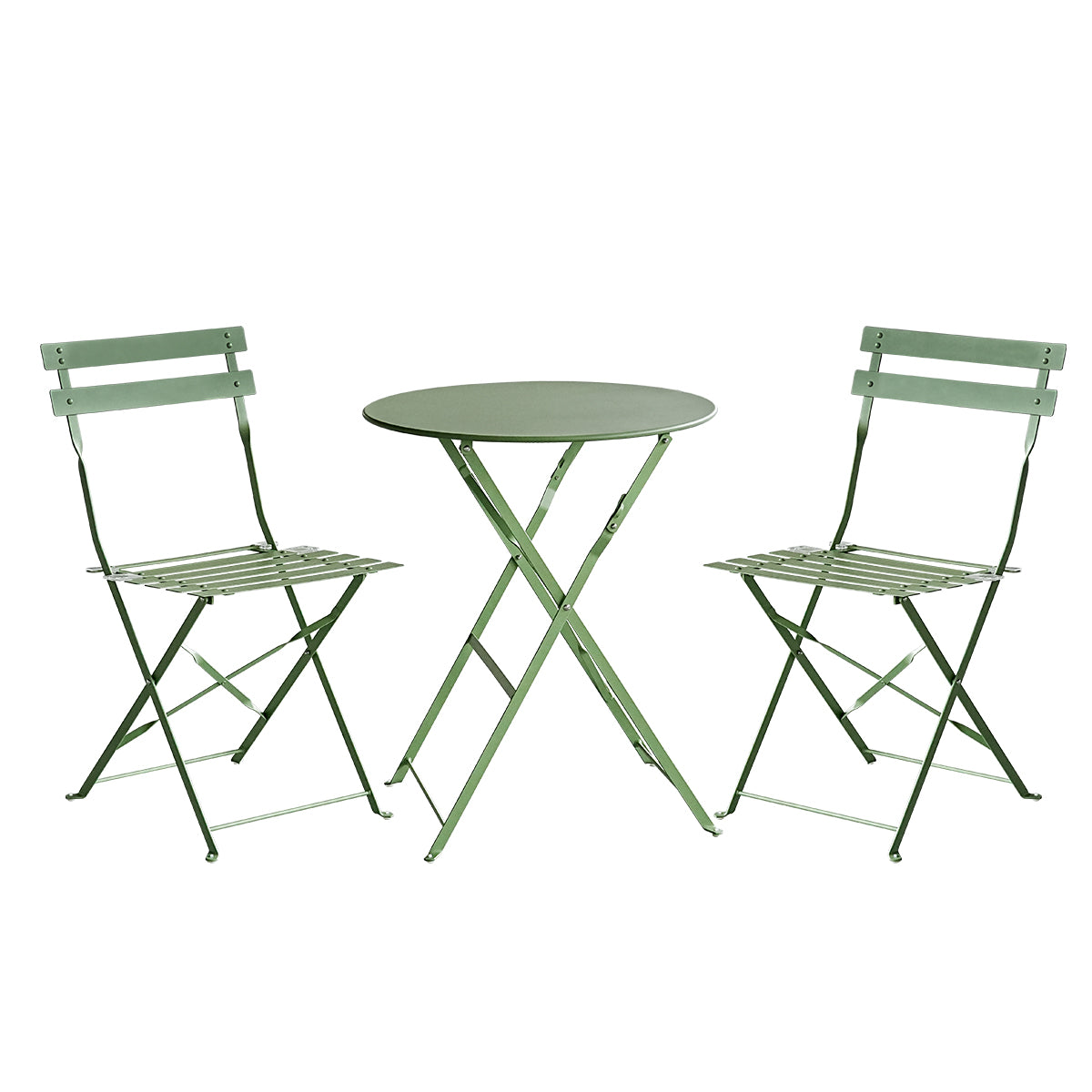 "סט זוגי ביסטרו לגינה, שולחן + 2 כסאות עשויים מתכת איכותית בצבע ירוק. השולחן והכסאות ניתנים לקיפול.