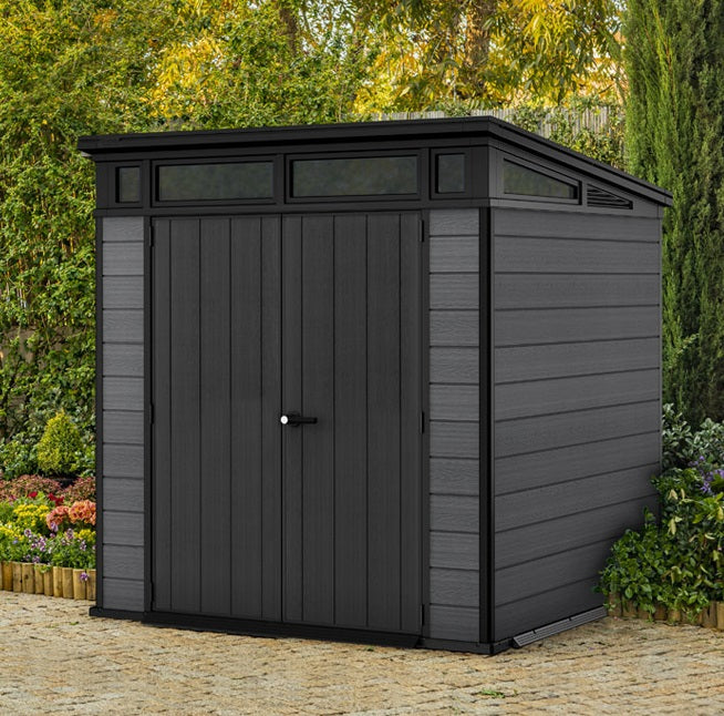 מחסן גינה קורטינה בעיצוב מתקדם ועכשווי, פתרון אחסון יעיל ונוח מבלי להתפשר על העיצוב. המחסן בנוי מלוחות EVOTECH ומחוזק במתכות, חזק ועמיד במיוחד.