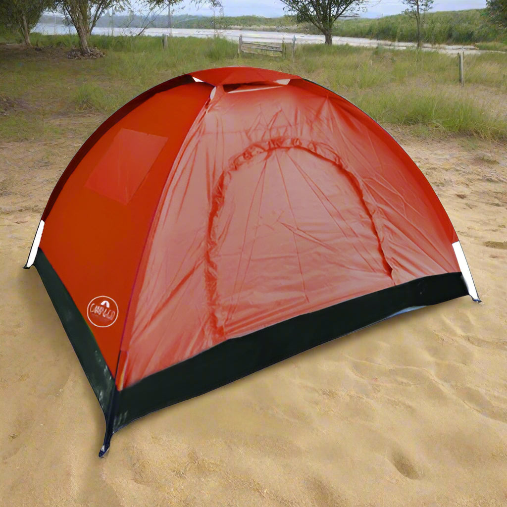 אוהל כיפה ל-2 אנשים עשוי בד פוליאסטר T190 עמיד PU500mm לטפטוף גשם קל לזמן קצר. פתח כניסה רחב, כולל 3 פתחי אוורור, 2 חלונות ופתח אוורור עליון. מוטות פיברגלס בעובי 6.9 מ”מ.