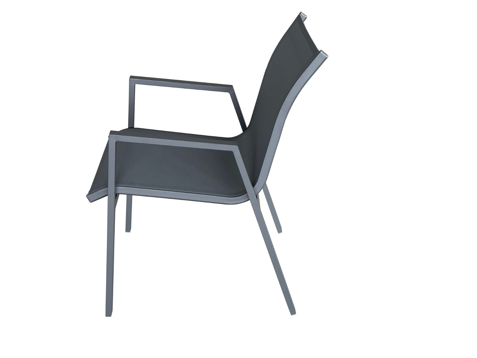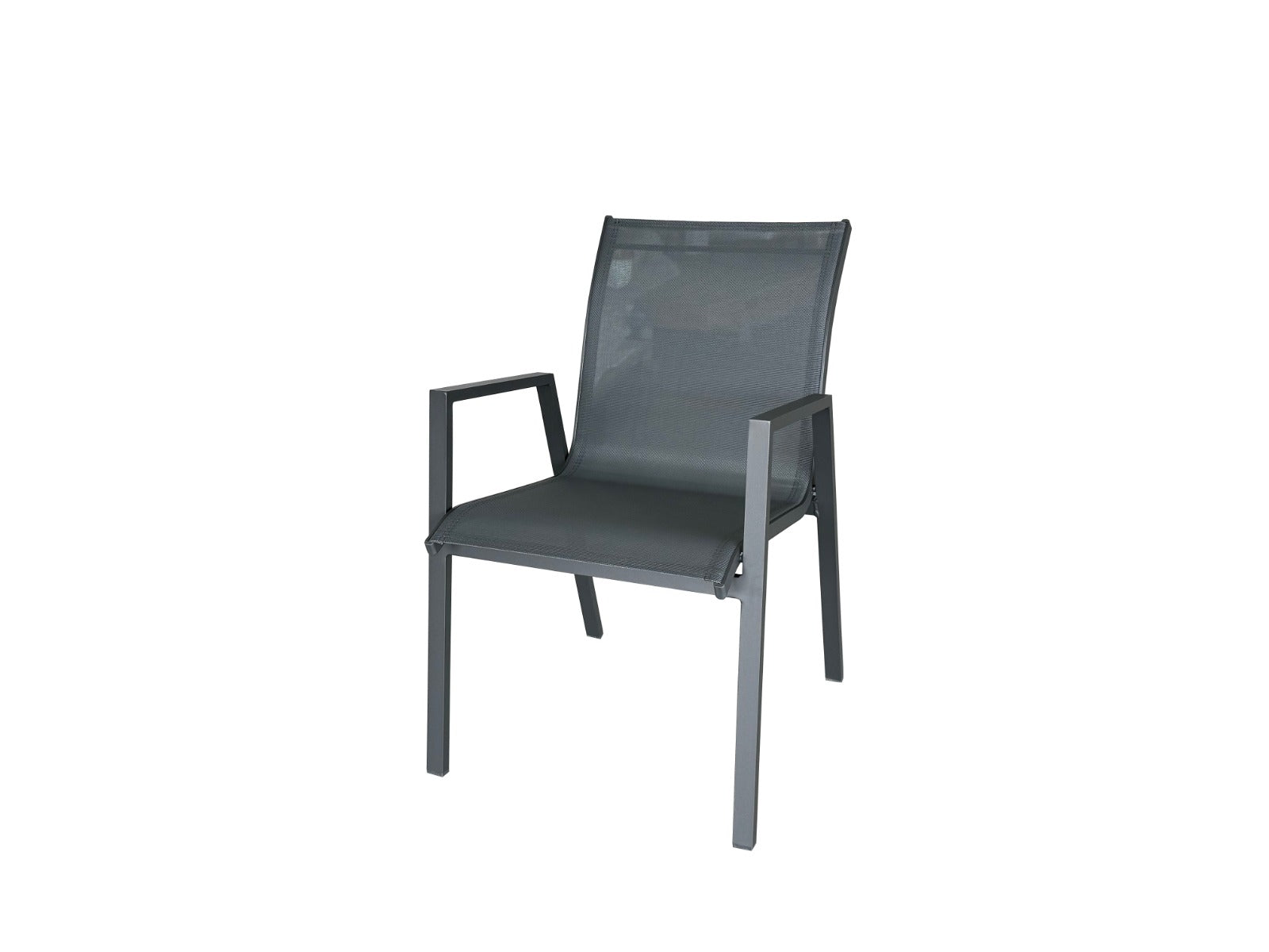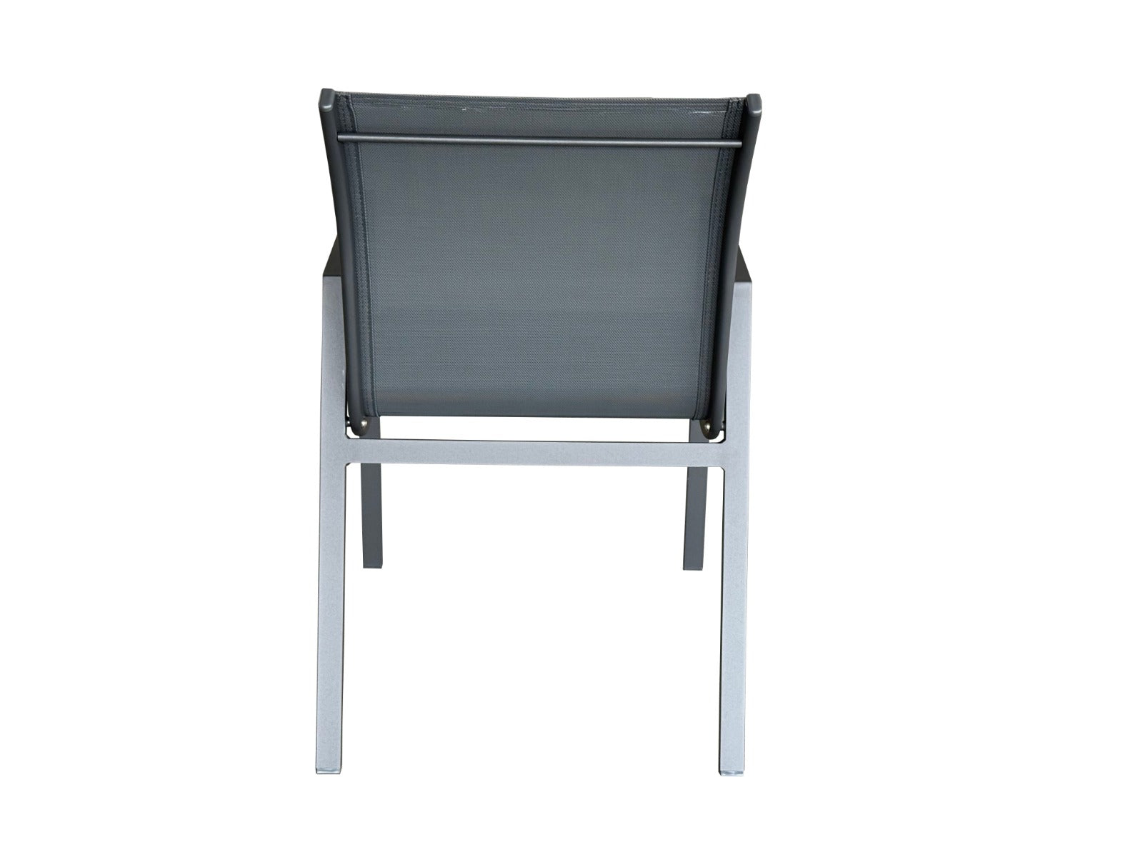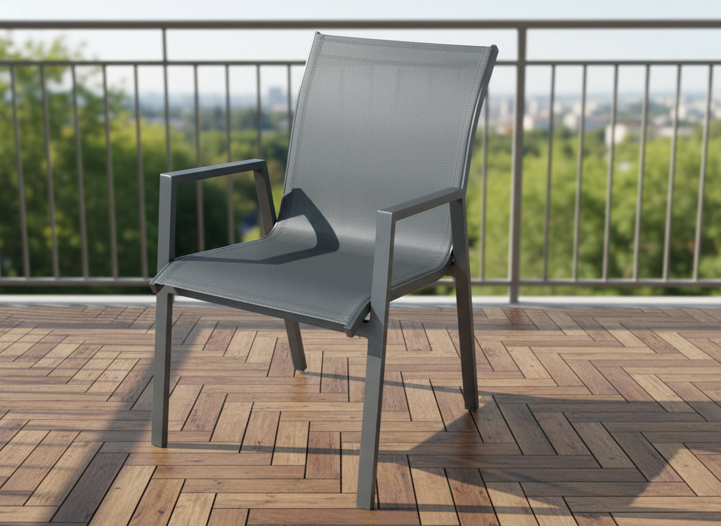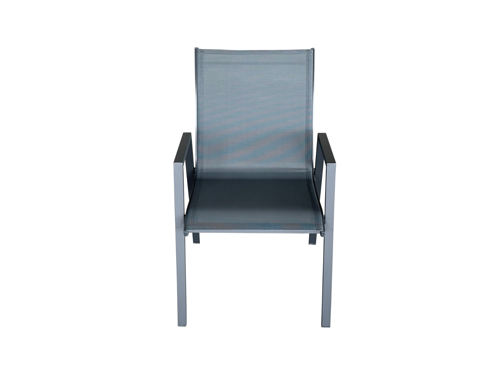 כסא אלומיניום לגינה ולמרפסת בצבע אפור כהה עם בד סלינג 1*2 בצבע אפור כהה. כסא נח לישיבה, ניתן לערום את הכסא לאחסון נח.