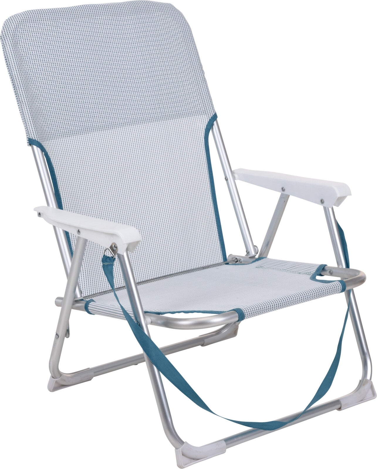 כסא ים נמוך עשוי אלומיניום איכותי, עשוי בד פוליאסטר סלינג 1*2, בצבע כחול. חיזוקי פלסטיק ברגליות הכסא ליציבות.