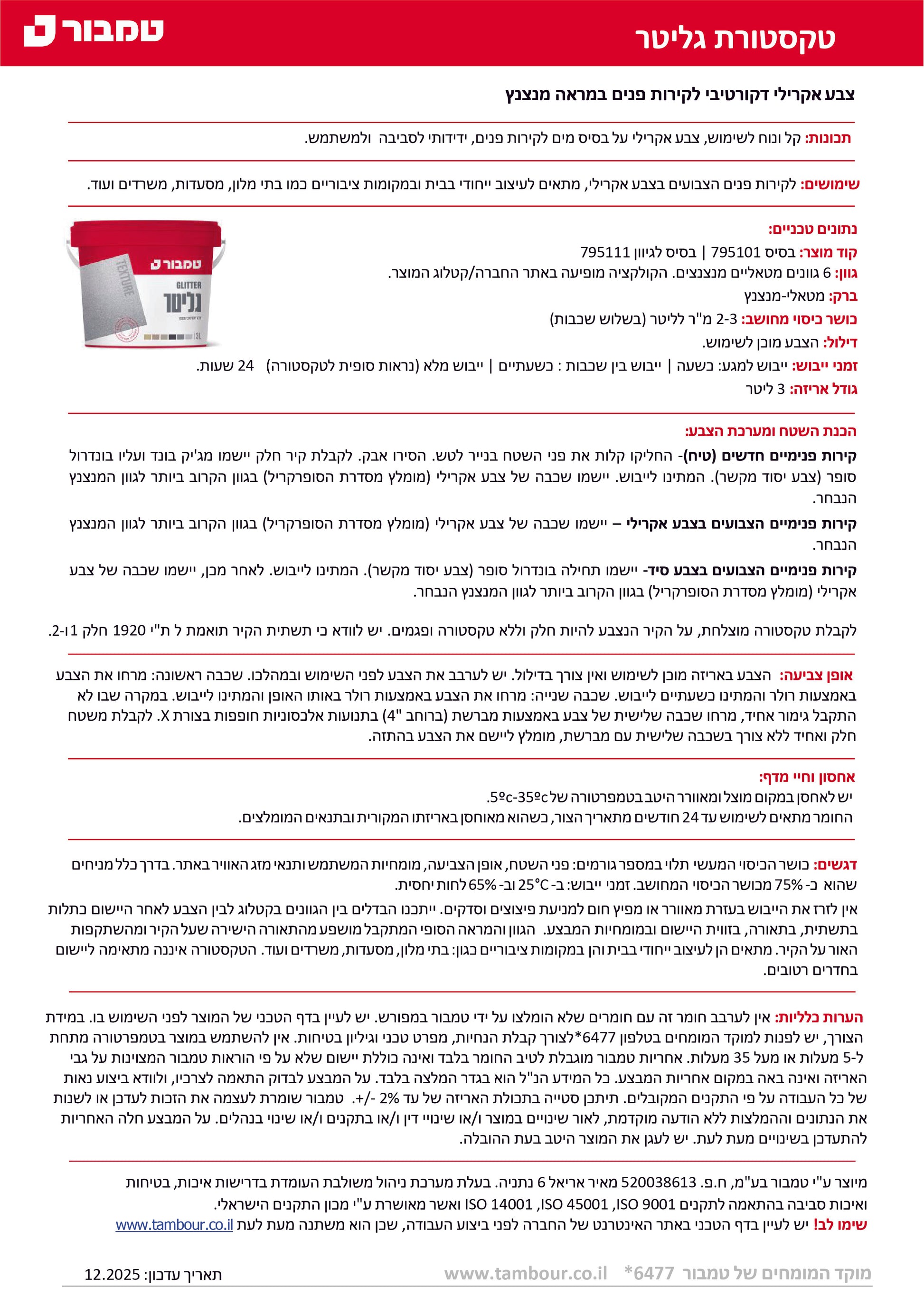 צבע אקרילי דקורטיבי לקירות פנים במראה מנצנץ. ליצירת גימור במראה מנצנץ מבית טמבור. מכיל 3 ליטר צבע. מיועד לקירות פנים הצבועים בצבע אקרילי, מתאים לעיצוב ייחודי בבית ובמקומות ציבוריים.