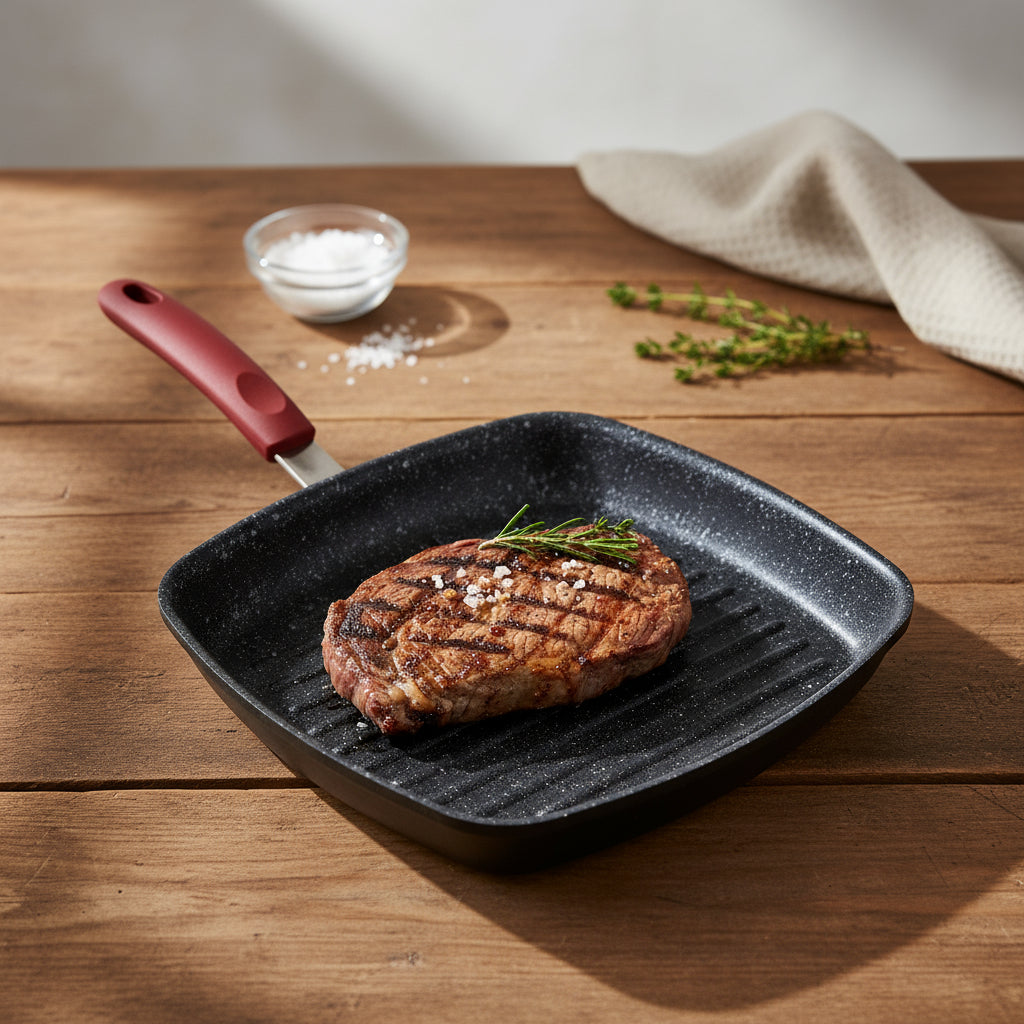 מחבת גריל אישית 20 ס"מ מיוצרת מיציקת אלומיניום בתהליך רב שכבתי. בטוחה לשימוש עם ציפוי רב שכבתי המונע הידבקות המזון.