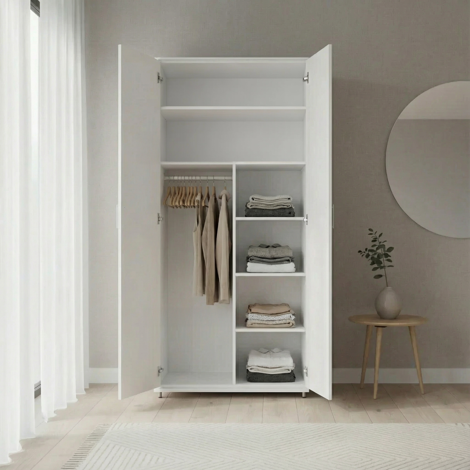 חלוקה של הארון: צד אחד תליה 40 ס"מ וצד שני 3 מדפים 40 ס"מ ומעל 2 מדפים 80 ס"מ.