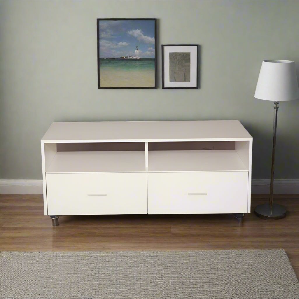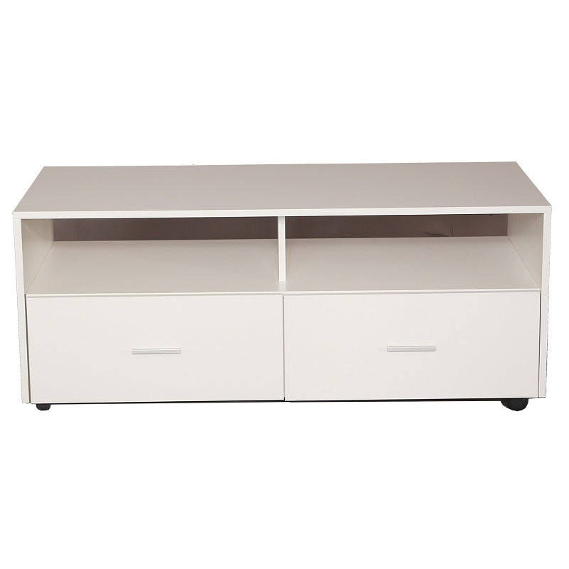 מזנון טלוויזיה קלאסי בצבע לבן, משלב חלוקה חכמה שמאפשרת אחסון חפצים רב.