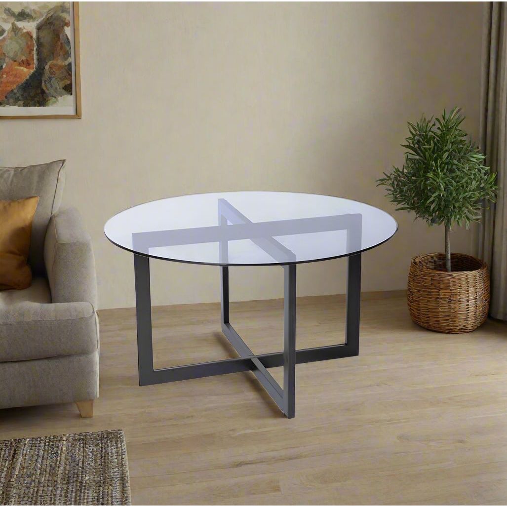 שולחן סלון עגול יוקרתי ואופנתי בצבע שחור, בעל זכוכית מחוסמת בעובי 8 מ"מ.