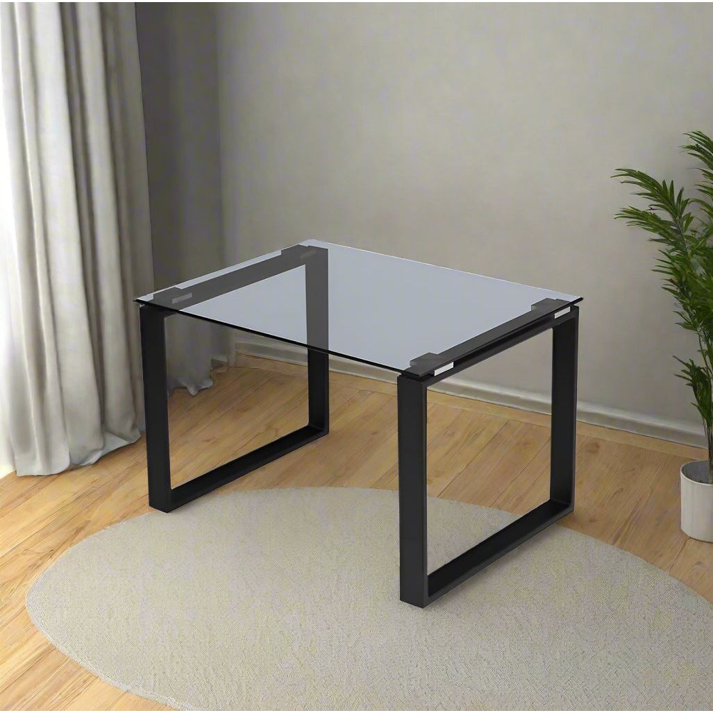 שולחן סלון שחור מרובע בעיצוב חדשני, בשילוב יוקרתי של זכוכית ומתכת. מתאים לסלון, חדר טלוויזיה או למשרד. שולחן קפה לסלון מבית LIVEA.