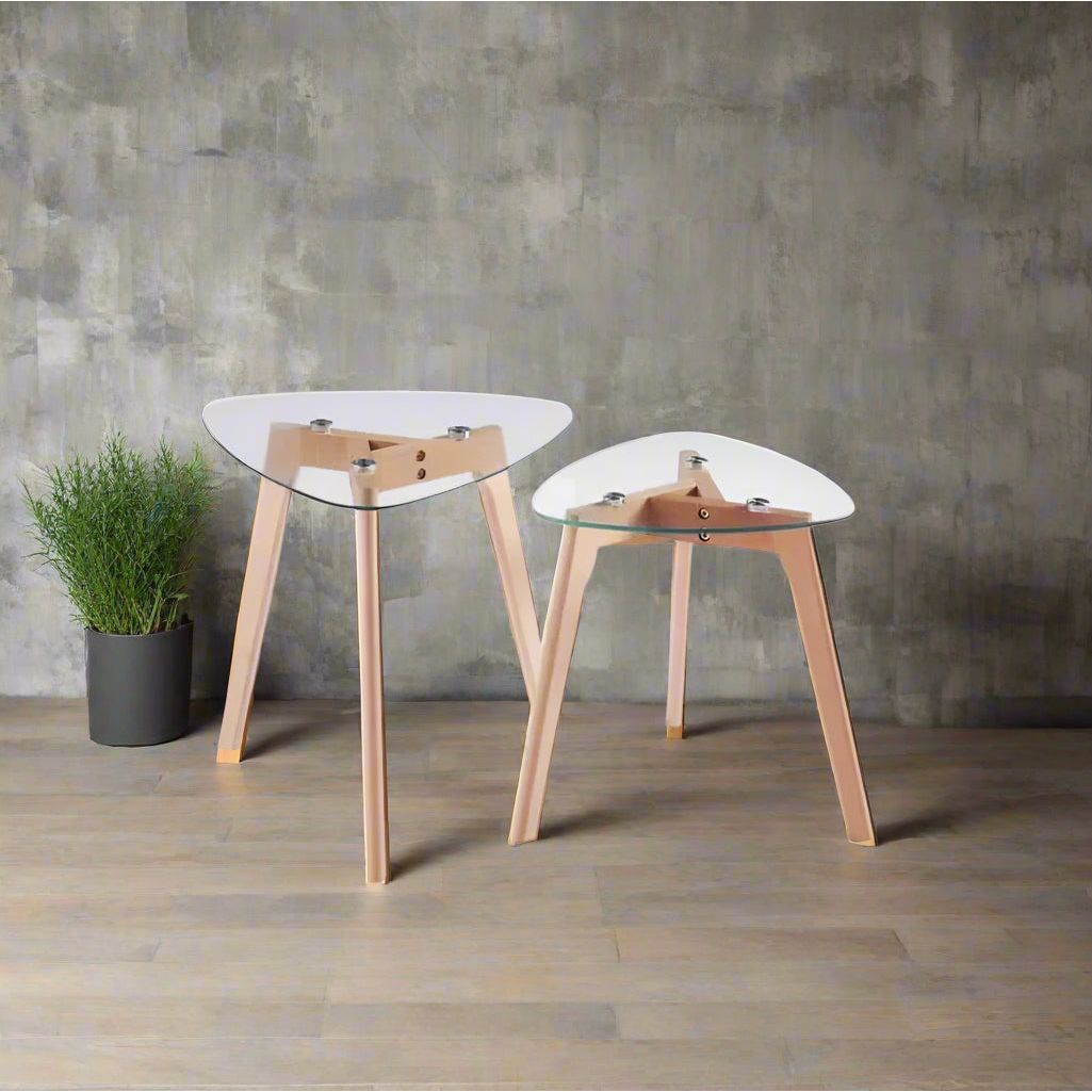 זוג שולחנות קפה בעיצוב אלגנטי. מורכבים מפלטת זכוכית בצורת משולש ורגליים יציבות ועמידות עשויות עץ. את השולחנות ניתן להכניס אחד בתוך השני ובכך ליצור מראה יפהפה וחסכוני במקום.