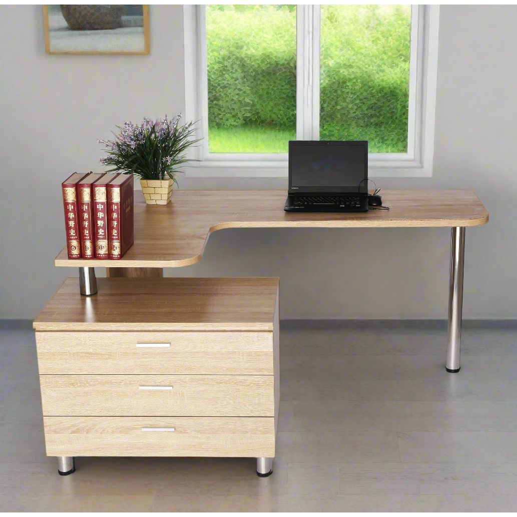 עמדת עבודה פינתית עידן בעיצוב חדשני וייחודי, מורכבת משולחן כתיבה הנשען על גבי יחידה עם 3 מגירות. רגלי העמדה מתכת חזקים ואיכותיים. העמדה מתאימה לשימוש ביתי או משרדי ומוסיפה לאווירת העיצוב הכללית של החדר.