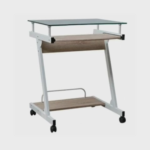 שולחן לכתיבה ולמחשב עם מגירת מקלדת. נוח, חזק ויציב, עשוי מתכת בשילוב משטח זכוכית 9 מ"מ ובעל גלגלים ניידים. מתאים למשרדים ושימוש ביתי, ואידיאלי עבור סטודנטים ותלמידים.