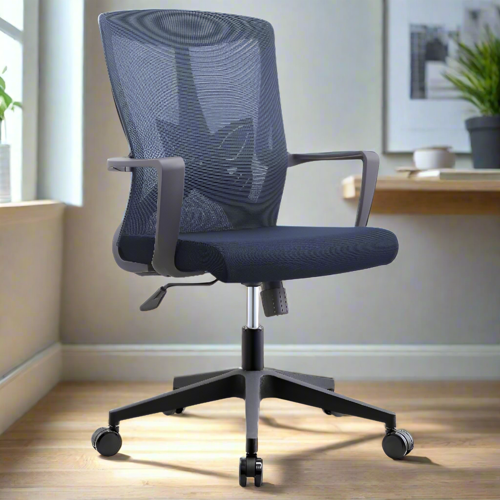 כיסא מחשב איכותי ועמיד, בעל בסיס עם 5 גלגלים ליציבות מרבית וניידות נוחה.