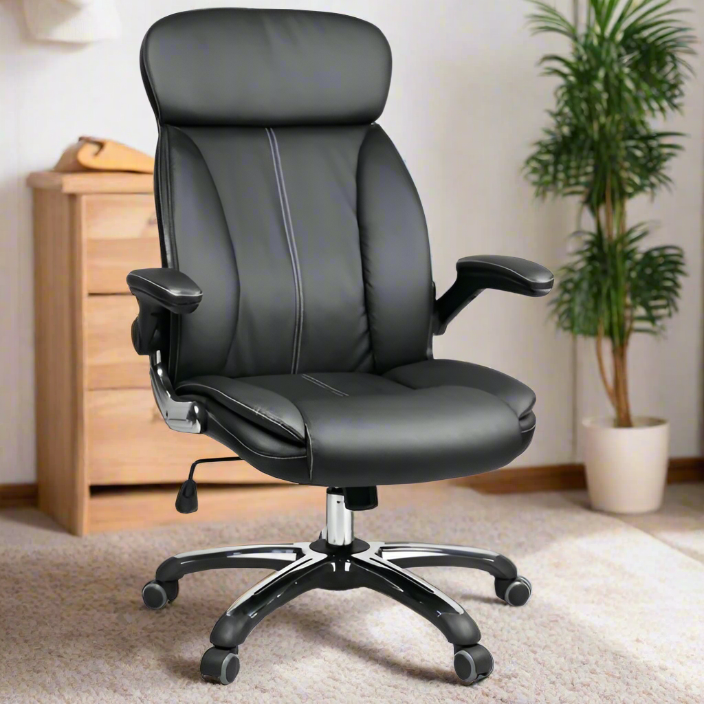 כיסא משרדי בעל משענת גבוהה וריפוד דמוי עור בצבע שחור. נוח, חזק ואיכותי, בעל מנגנון לכיוון גובה המושב.