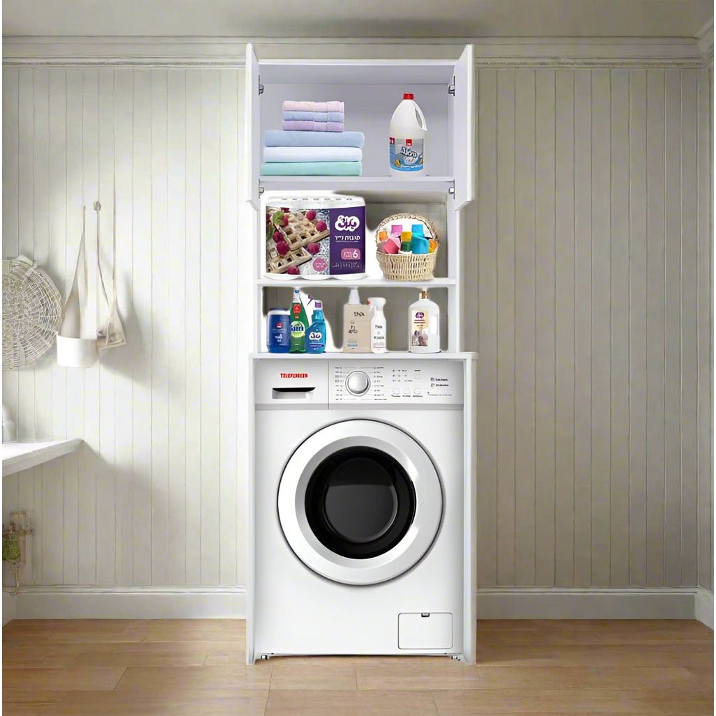 ארון אחסון למכונת הכביסה, עיצוב נקי עם מקום רב לאחסון. כולל 2 דלתות עליונות ומשטח עבודה.