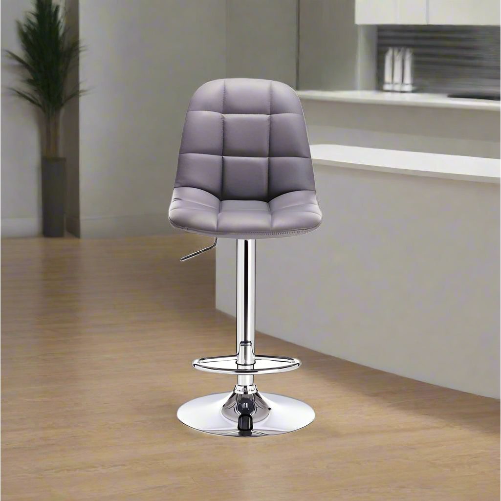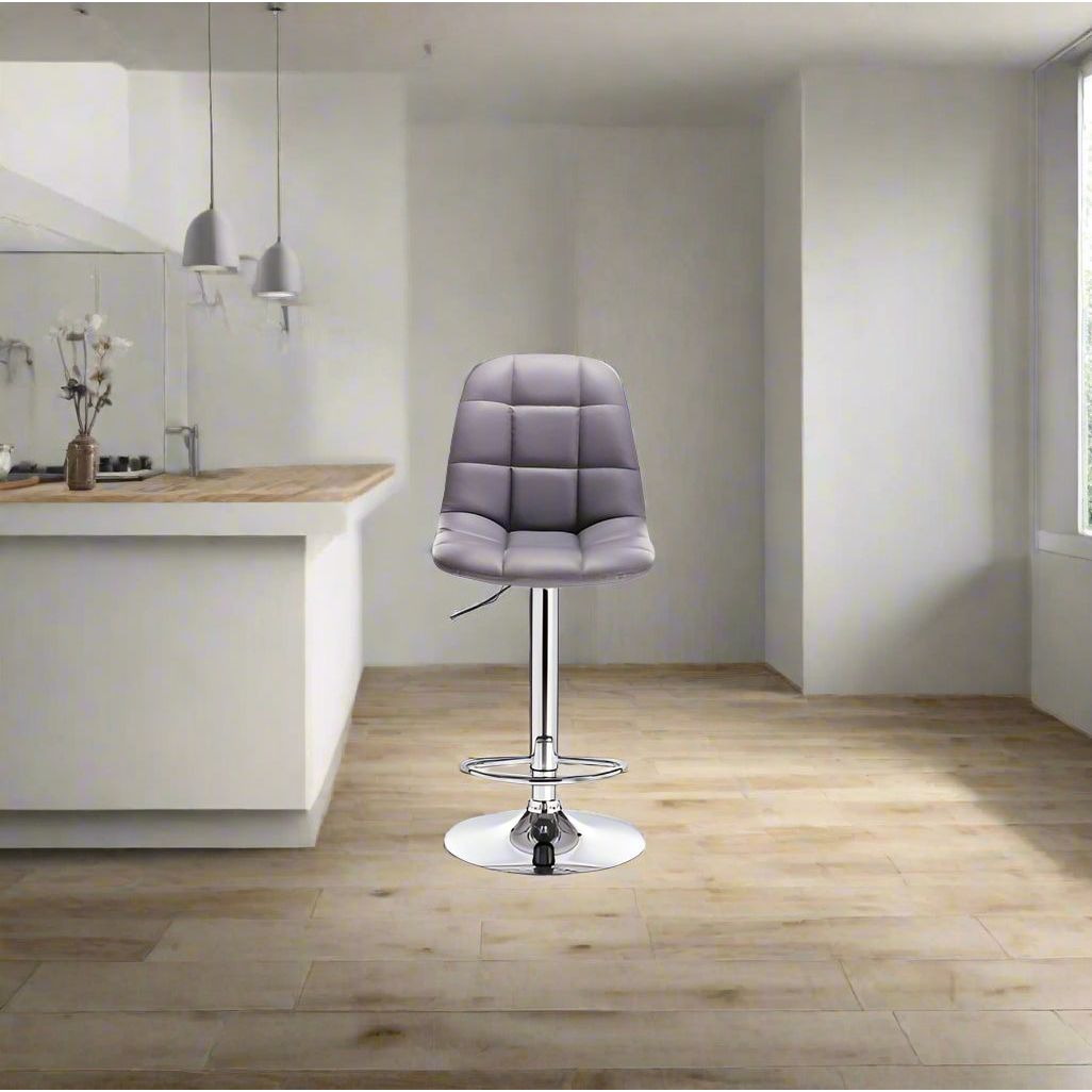 כסא בר מרופד דמוי עור נעים בצבע אפור, בשילוב עם משענת עגולה ודוגמא של ריבועים אשר נותנת מראה קלאסי ומיוחד. כיסא נוח ושימושי שמכיל גם בוכנה לקביעת גובה הכיסא עם בסיס רגל כרום.