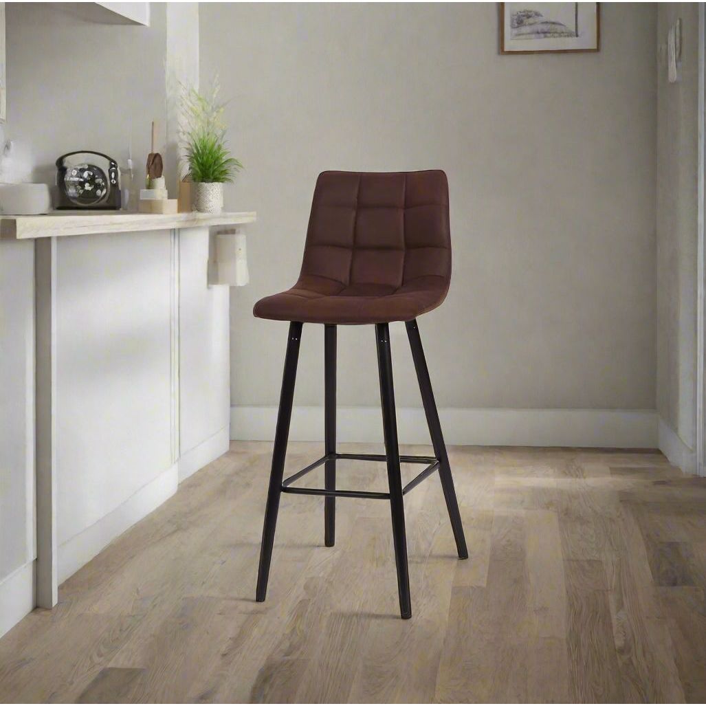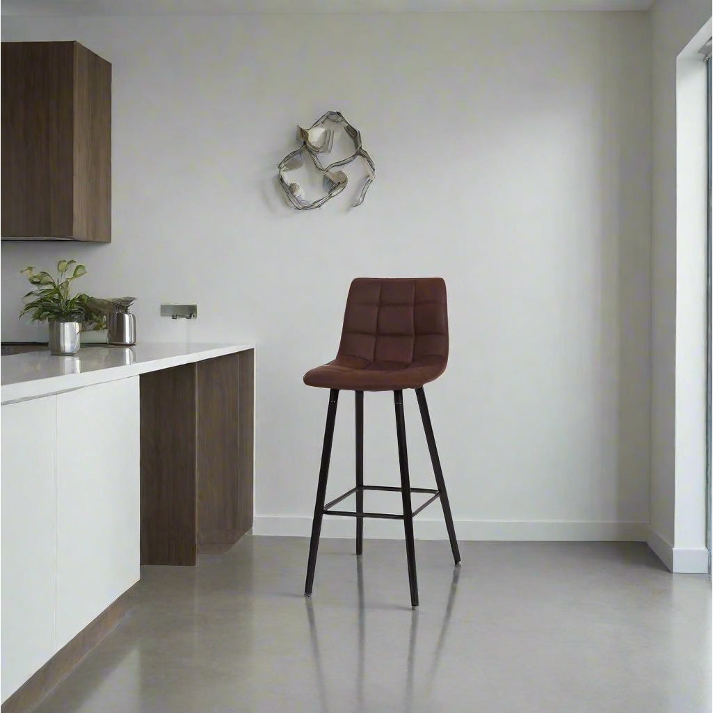 כיסא בר מעוצב בצבע חום, בעל מושב מרופד בבד קטיפתי עם דוגמא של ריבועים במראה קלאסי ועדין.