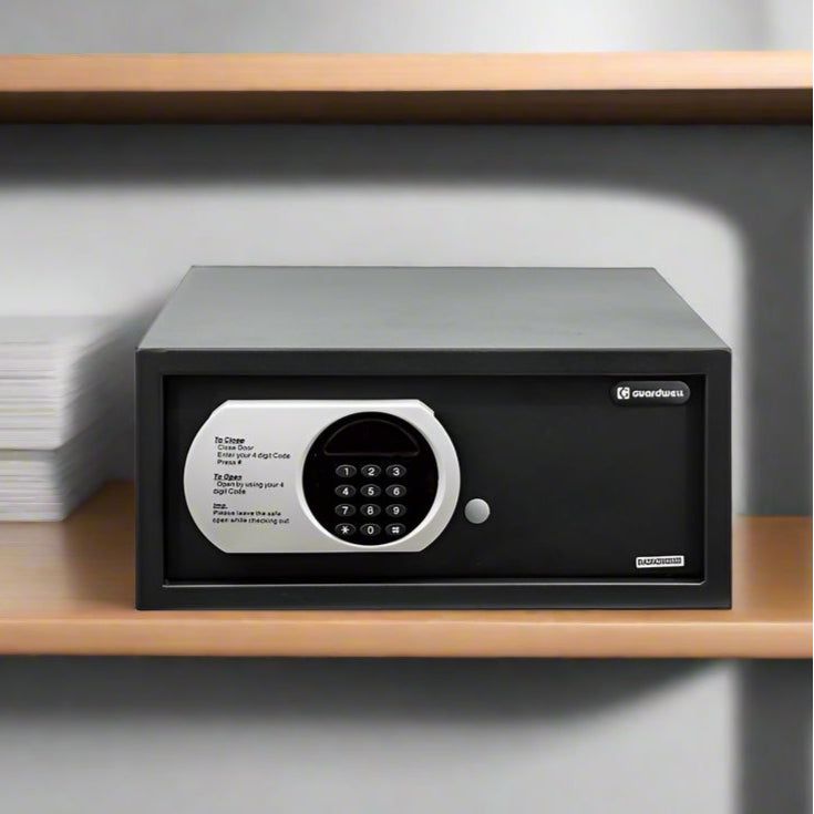 כספת ביתית או לשימוש משרדי, עשויה פלדה עבה וחזקה, בעלת צג דיגיטלי מופעלת באמצעות קוד סודי.