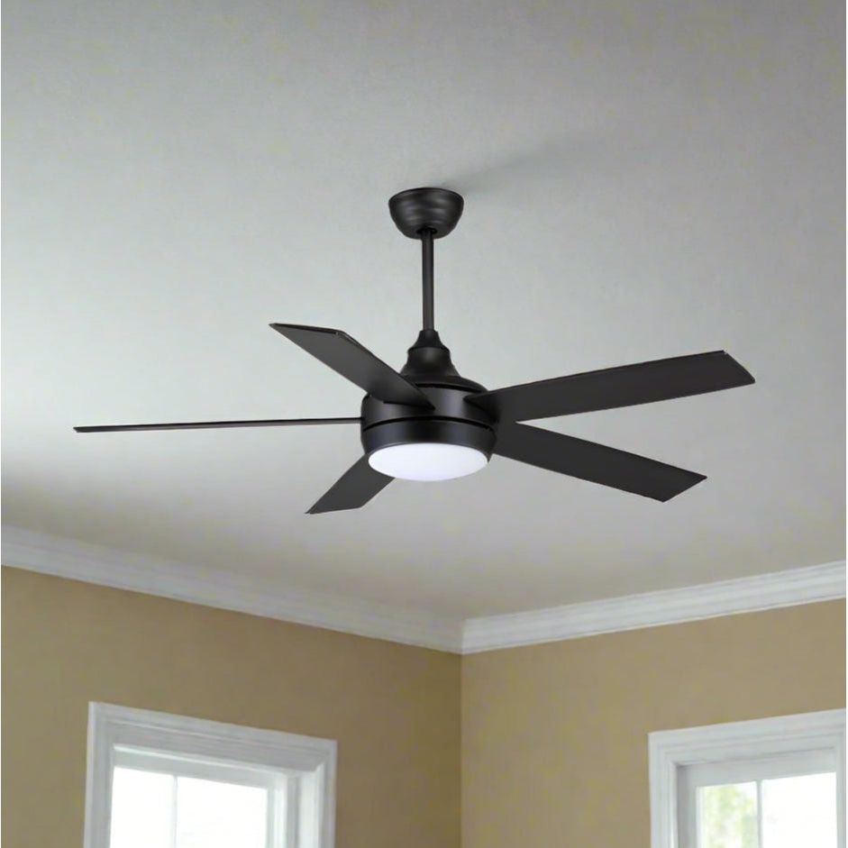 מאוורר תקרה דקורטיבי בצבע שחור בגודל "52 עם תאורת LED 15W. למאוורר 5 כנפיים המקנות פיזור מקסימלי של האוויר בחדר.